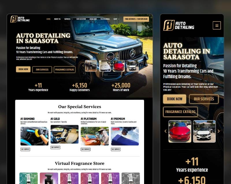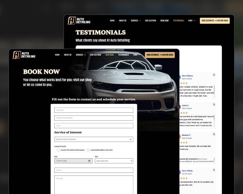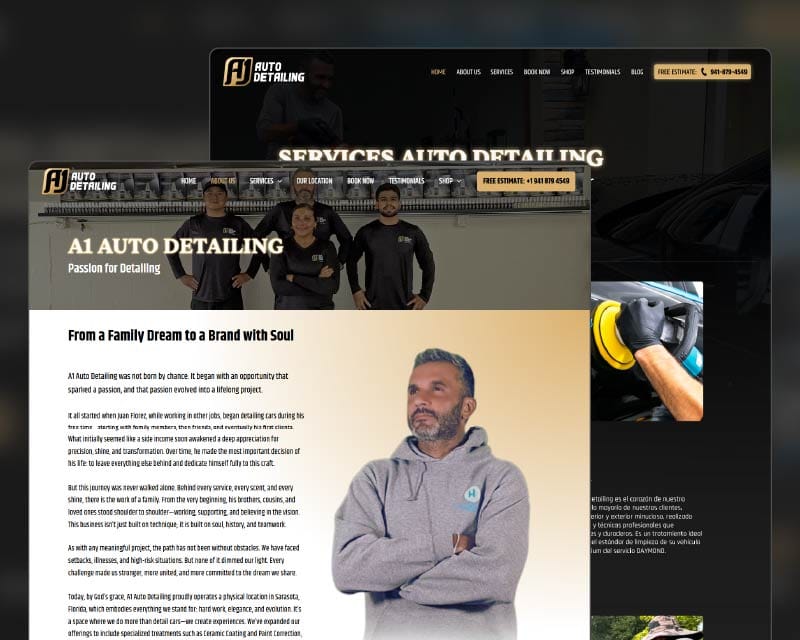 Con una profunda satisfacción culmine el diseño y desarrollo del sitio web para A1 Auto Detailing, una empresa que opera en Sarasota, Florida. Con una gran proyección les ayude con el rediseño de su marca -dejo el link por acá- y con este sitio web que tiene como objetivo lograr su posicionamiento en Google dentro de su zona de influencia.